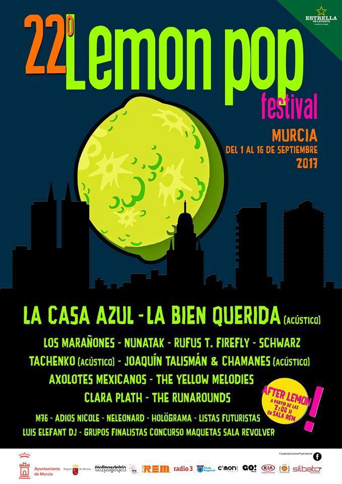 El festival Lemon Pop de Murcia cumple 22 años con una nueva edición que tendrá lugar del 1 al 16 de Septiembre. A pesar de los rumores sobre su posible final, el longevo festival contará con cuatro noches llenas de música gracias a grupos como La Casa Azul, La Bien Querida, Los Marañones, Nunatak, Rufus T. Firefly, Schwarz, Tachenko, Joaquín Talismán & Los Chamanes, Axolotes Mexicanos o The Yellow Melodies.
