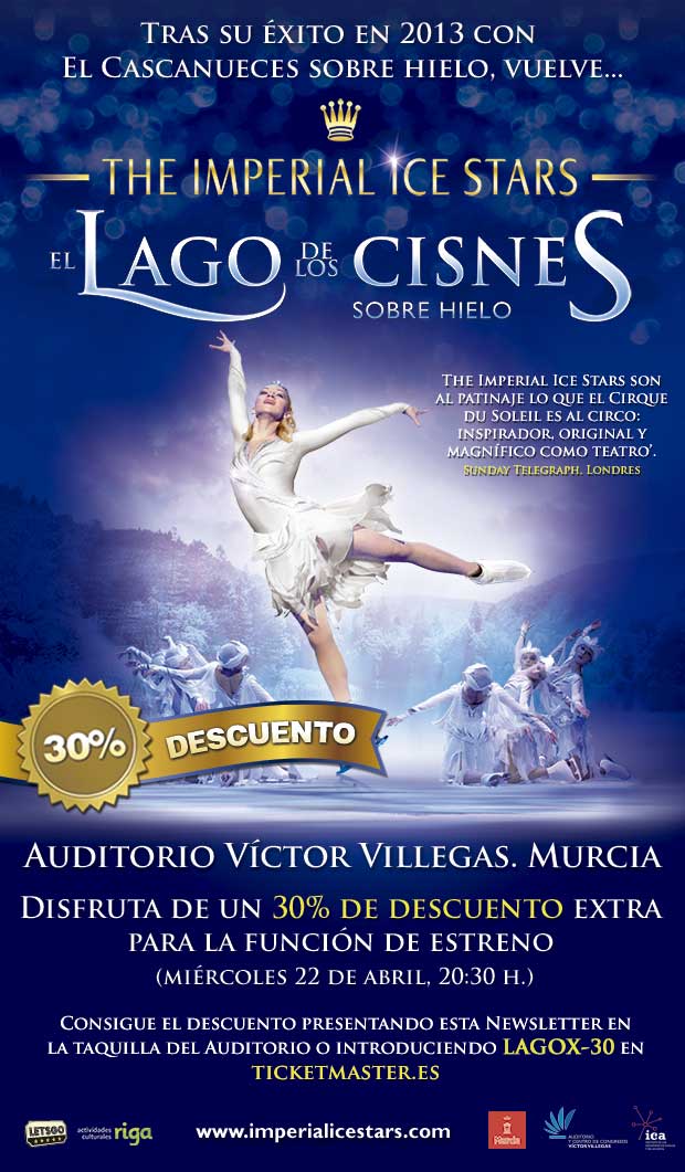 Una de las más prestigiosas compañías de patinaje artístico sobre hielo, regresa al Auditorio de Murcia para convertirlo en un espectacular lago helado sobre el que se representará la más afamada obra de Tchaikovsky: El Lago de los Cisnes. Las claves del éxito de The Imperial Ice Stars están no solo en la cercanía y emotividad que logran despertar en el espectador, sino además en la habilidad y sublime destreza acrobática de sus patinadores, entre los que atesoran más de 250 medallas en competiciones mundiales. La perfección en la ejecución de espirales mortales, dobles y triples axels, y espectaculares elevaciones a alta velocidad se ponen ahora al servicio del clásico. El lago de los cisnes en una gran producción cuyo equipo creativo ha puesto en escena varias creaciones del Cirque du Soleil y los más importantes musicales del West End y Broadway, como Los Miserables, El fantasma de la ópera, Cats o West Side Story.