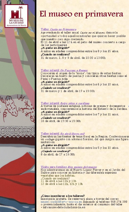 La inscripción de cualquier taller o visita es gratuita. Las reservas se podrán hacer a través del teléfono 968 274 390 , del correo electrónico museo.ciudad@ayto-murcia.es o presencialmente en el museo hasta el día anterior al inicio del taller.