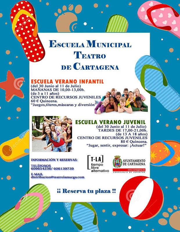 La Escuela de Verano de Teatro, Infantil y Juvenil, ha abierto ya el plazo para reservar plaza e inscribirse en estos talleres que se ofrecen en vacaciones. La Escuela Municipal de Teatro de Cartagena organiza esta actividad junto con La Murga Teatro, con la colaboración del programa del T-LA (Tiempo Libre Alternativo) de la Concejalía de Juventud.