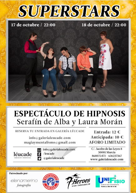 Los próximos viernes 17 y sábado 18 de octubre, a las 22:00, se va acelebrar en Galería Léucade el nuevo espectáculo de hipnosis de Serafín de Alba y Laura Morán. Reserva tu entrada de forma anticipada por 10€, o adquiérela en taquilla por 12€. El aforo es limitado.