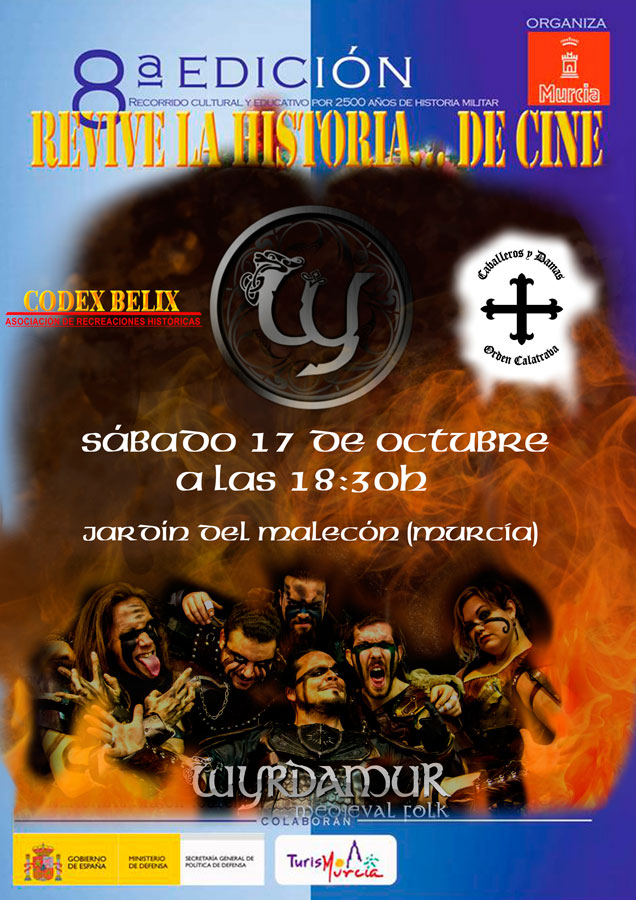 Wyrdamur Medieval Folk, continúa invadiendo territorios, y en esta ocasión reclamaremos nuestras mismas tierras, pues este Sábado 17 de Octubre de 2015, tendrá lugar un espectáculo musical junto a sus hermanos de batallas los Caballeros y Damas de la Orden de Calatrava, dentro del marco de la 8ª Edición de"REVIVE LA HISTORIA...DE CINE", organizado por el Ayuntamiento de Murcia y CODEX BELIX..