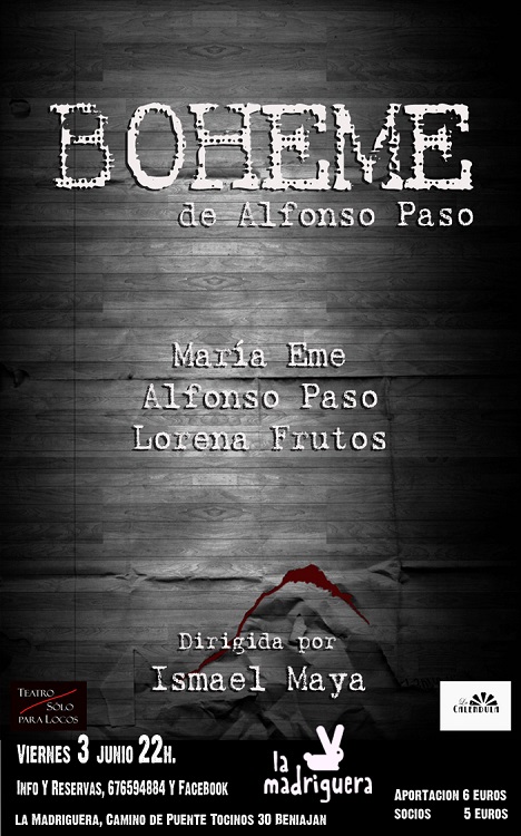 Teatro ólo para locos y La Calendula Teatro representarán "Bohème" de Alfonso Paso el próximo viernes 3 de junio en La Madriguera. Dirigido por Ismael Amaya y con un reparto compuesto por Lorena Furtos, María Eme y Alfonso Paso, "La Bohème" es una versión libérrima que coge la esencia de los personajes de la ópera de Puccini y de su precedente "Scènes de la vie de Bohème" de Henri Murger, conformando la historia de un triángulo amorosoen el que un escritor se ve forzado a elegir entre dos mujeres, la vida o la muerte.