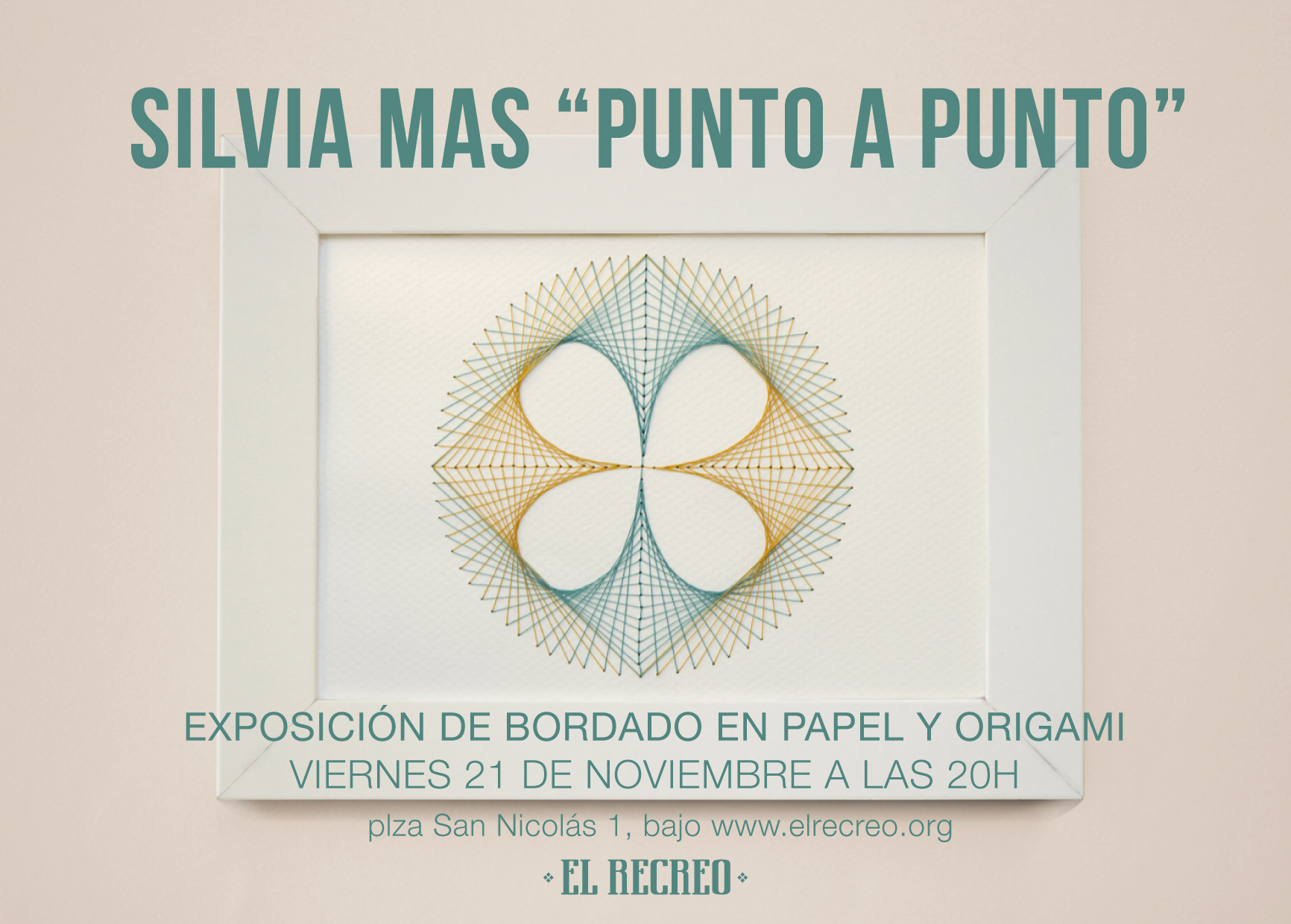 Si te gustan las cosas bonitas hechas a mano no te puedes perder, el viernes 21 de noviembre, a las 20:00 la exposición de Silvia Mas "Punto a Punto", en El Recreo.