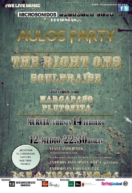 Aulos Party tendrá lugar el próximo 14 de febrero en la emblemática sala 12&Medio de Murcia a partir de las 22:30 horas. Durante la fiesta, se podrá disfrutar de las actuaciones de la bandas nacionales The Right Ons y Soulpraise, para continuar la fiesta bailando al ritmo de las grandes sesiones de Marcapaso y Plutonita.
