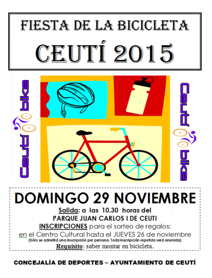 El próximo domingo 29 de noviembre el municipio de Ceutí vivirá una nueva edición de la “Fiesta de la Bicicleta”, organizada por la Concejalía de Deportes en colaboración con la empresa local “CeutiBike”. Con salida a las 10:30 desde el Parque Juan Carlos I, los participantes realizarán un divertido recorrido por las calles del pueblo. Los únicos requisitos para participar son saber montar en bici y tener ganas de pasarlo bien practicando deporte en compañía de amigos y familiares, y el recorrido es apto para todas las edades.