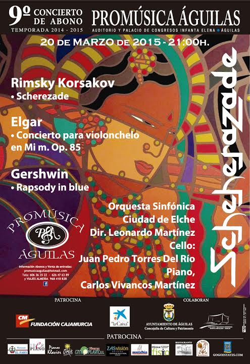 A las 21 horas, en el Auditorio y Palacio de Congresos Infanta Doña Elena, la Asociación ProMúsica Águilas presenta su IX concierto de abono de la temporada a cargo de la Orquesta Sinfónica “Ciudad de Elche”, bajo la dirección de Leonardo Martínez, con Juan Pedro Torres al cello y Carlos Vivancos al piano. El repertorio incluirá: Scherezade de Rimsky Korsakov; Concierto para violonchelo, en mi m. – Op. 85, de Elgar; y Rapsody in blue de Gershwin.Las entradas se pueden adquirir en Almeida Viajes, al precio de 15 euros, o el mismo día del evento, desde dos horas antes, en las taquillas del recinto.