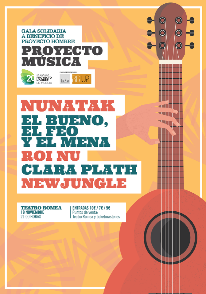 Proyecto Hombre celebra sus 20 años con una Gala benéfica el 19 de noviembre en el Teatro Romea de Murcia, será a las 21:00, y contará con cinco bandas que fueron seleccionadas por medios especializados y expertos de la Región para participar en Big Up Murcia, que cumplió el pasado ocubre tres ediciones: New Jungle, Clara Plath, Roi Nu, El Bueno el Feo y el Mena y Nunatak.