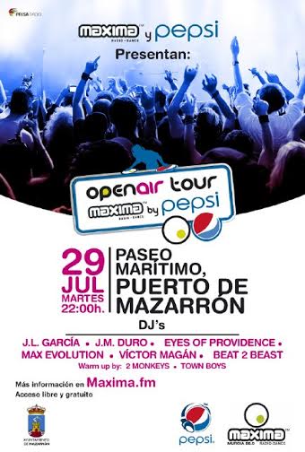 La noche del martes 29 de julio se darán cita, en la playa del Puerto, los mejores dj’s y artistas de la escena musical. Han confirmado su presencia JL García y JM Duro, además de Víctor Magán, Eyes of Providence, Beat2beast, Max Evolution y los dj’s locales: 2 monkeys, Town Boys y Germán Ortiz, dj de Mazarrón y ganador del concurso organizado por Pepsi en 2013.