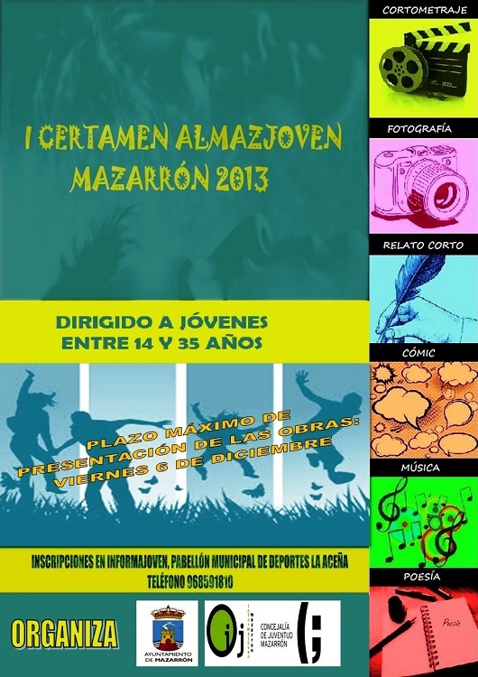 La concejalía de Juventud del Ayuntamiento de Mazarrón ha puesto en marcha el I Certamen de Creación Artística Almazjoven 2013, a través del cual los jóvenes de entre 14 y 35 años pueden mostrar sus habilidades artísticas con el cortometraje, la fotografía, el relato corto, el cómic, la música y la poesía. Las bases del concurso pueden consultarse en la web municipal pero es aconsejable acudir con anterioridad al Informajoven a formalizar la inscripción antes de presentar los trabajos.