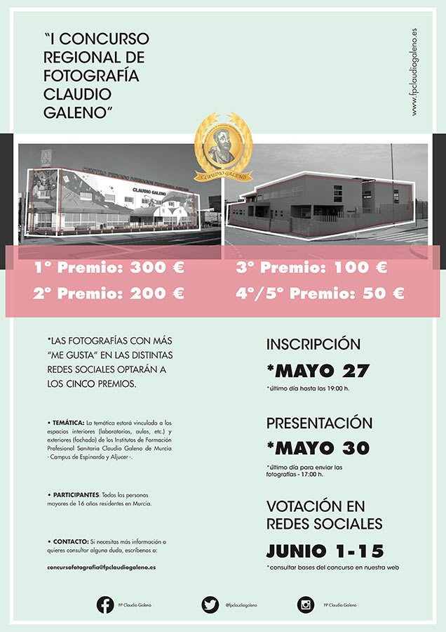 Para conocer detalladamente el método de inscripción, las condiciones del envío de las fotografías, los plazos o el proceso de selección en las redes sociales, entre otros muchos apartados, podéis consultar las bases visitando la siguiente dirección: http://www.fpclaudiogaleno.com/images/PDF/bases-concurso-fotografia.pdf