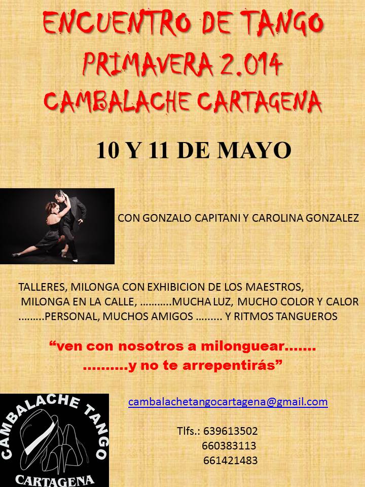 Cambalache Tango Cartagena ha organizado el Encuentro de Tango Primavera 2014, que se va a celebrar los días 10 y 11 de mayo en el local social de Nueva Cartagena, el sábado, y el Casino de la calle Mayor, el domingo.