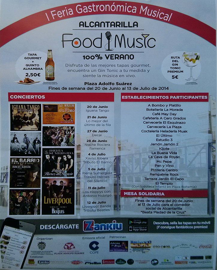 Con la llegada del veranito, da gusto salir a la calle y tomarte un quinto bien fresquito, y si a esto le sumamos una tapa, conseguimos una nueva ruta de la tapa. Pero esta vez se le añade también música enla "I Feria gastronómica musical" de Alcantarilla; Food Music 100% Verano.