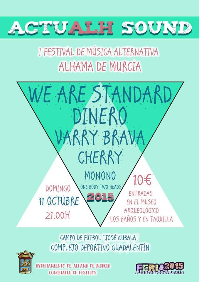 El próximo domingo 11 de Octubre, con motivo de sus fiestas patronales, tendrá lugar la I edición del ActuAlh Sound, festival de música alternativa de Alhama de Murcia. Esta primera entrega cuenta con un cartel encabezado por los vascos We Are Standard y los madrileños Dinero. El resto del cartel bebe de las calles murcianas con Varry Brava, Cherry , One Body Two Heads y Monono.