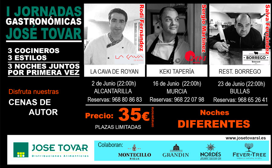 Los días 2, 16 y 23 de Junio no puedes faltar a las I Jornadas Gastronómicas Jose Tovar. La empresa murciana de distribución alimenticia Jose Tovar, SL, organiza este encuentro con la gastronomía para reunir a tres importantes chefs de Murcia que conducirán tres cenas de autor únicas en Murcia.