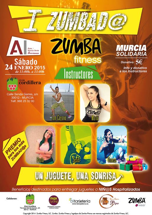 Este sábado 24 de enero, en el Club Cordillera de Murcia, de 11:00 a 13:00 tendrá lugar el primer Zumbad@, un evento benéfico en el que los participantes aportarán a modo de donativo 5 euros, que irán destinados a la compra de juguetes didácticos para niños hospitalizados.