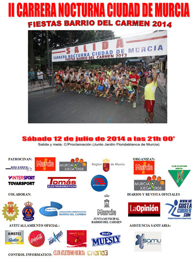 Ya está abierto el plazo de inscripción de la II Carrera Nocturna Ciudad de Murcia "Fiestas Barrio del Carmen, a celebrarse el día 12 de Julio, a partir de las 21h 00.