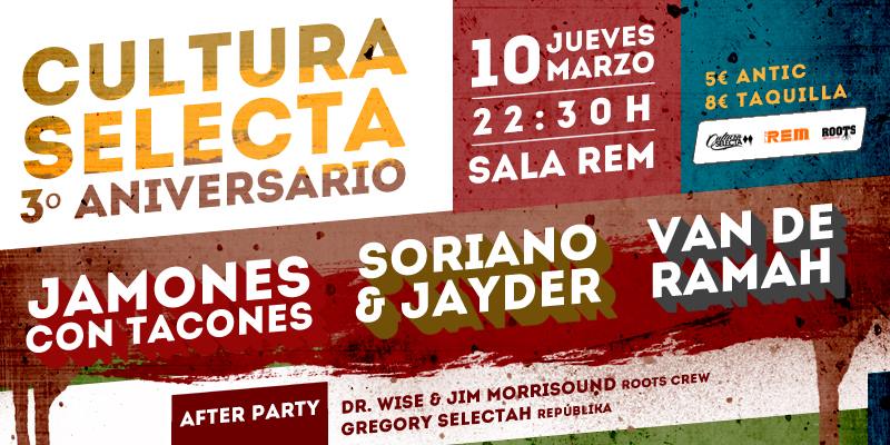 Jamones con Tacones, Soriano & Jayder y Van de Ramah estarán en Sala REM para celebrar el tercer aniversario de Cultura Selecta. Para rematar la noche podrás disfrutar de un After Party compuesto por DR.Wise & Jim Morrisound (Roots Crew) y Gregory Selectah (Repúblika)