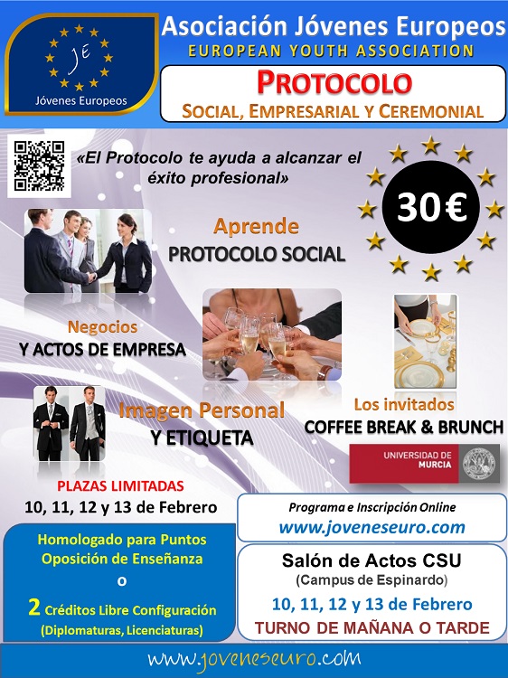 La Asociación de Jóvenes Europeos ha organizado las III Jornadas de Protocolo Social, Empresarial y Ceremonial. Durante las jornadas se tratarán contenidos afines a muy diversas áreas de actividad y conocimiento: turismo, marketing, relaciones públicas y publicidad, derecho,..., la materia a tratar no pasa inadvertida para nadie. Tan necesario es "saber estar" en todo momento, como desenvolverse con soltura en la organización de eventos para nuestra empresa o redactar con corrección cualquier escrito dirigido a un ente administrativo.