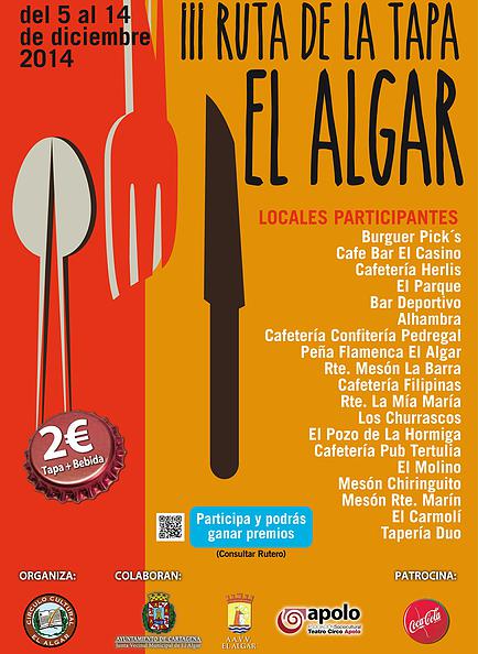 Por sólo 2€, se podrá degustar una buena tapa + con bebida, desde mañana 5, y hasta el 14 de diciembre, en 19 establecimientos de la localidad de El Algar, fechas en las que se celebra la III Ruta de la Tapa de la localidad cartagenera.