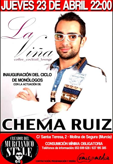 Tres meses va a durar el ciclo de comedia que hay programado en La Viña, en Molina de Segura. Todos los Jueves podrás disfrutar de la mejor comedia con entrada gratuita (consumición mínima obligatoria). Y qué mejor manera de arrancar el ciclo que con la actuación inaugural de Chema Ruiz.