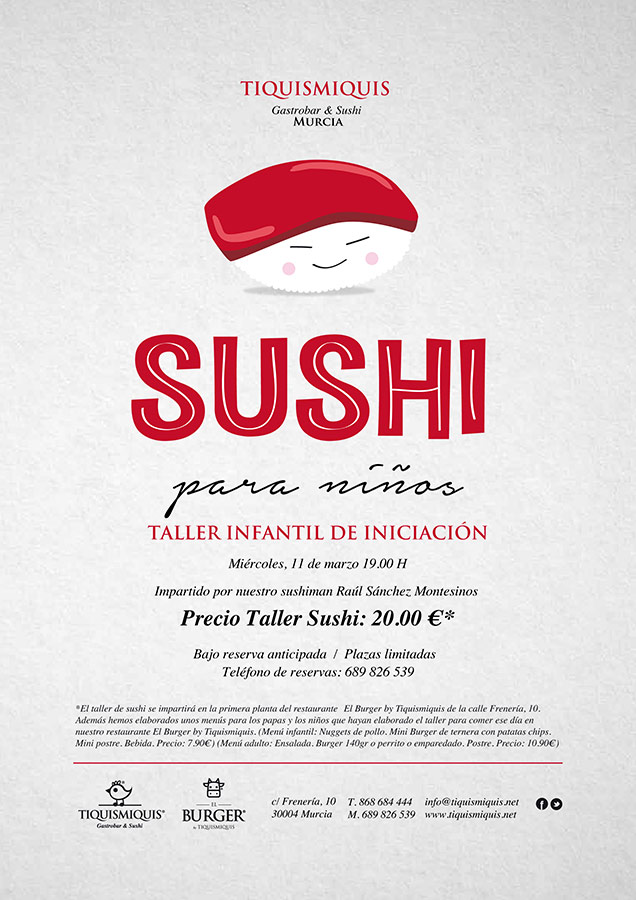 Si no tuviste oportunidad de llevar a tu hijo al taller de iniciación al Sushi de Tiquismiquis, este Miércoles 11 de Marzo a las 19:00 tienes una nueva oportunidad. Deja que tu hijos prueben un nuevo estilo de cocina, donde además se divertirán, ya que la realización del sushi es todo con las manos.