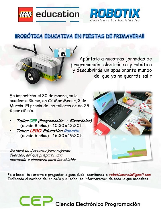 Ambos talleres se impartirán en la Academia Blume (Calle Mar Menor, 3, Murcia) y tienen un precio de 25 €. Para más información y reservas, manda un correo a robotixmurcia@gmail.com indicando la edad y el nombre del niño/a interesado.
