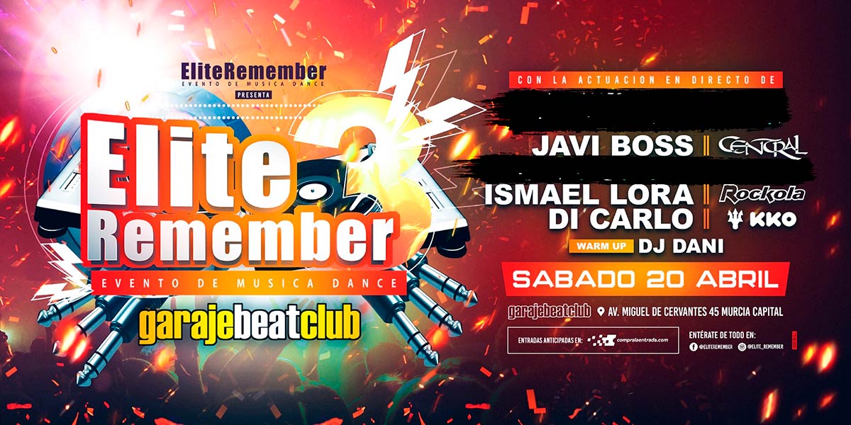 Élite Remember vuelve a juntar en cabina algunos de los deejays más importantes de los 90 para ofrecer una magnífica fiesta con la mejor música de antes. El mítico JAVI BOSS lleva 20 años siendo residente de una de las salas de música electrónica más emblemáticas del país, Central Rock, en su Almoradí natal. Especializado en música hardcore, es uno de los productores más prestigiosos del estilo a nivel internacional, con actuaciones en clubes de toda Europa y en algunos de los festivales de hardcore más importantes a nivel mundial. Compartirá lineup con el también alicantino ISMAEL LORA, residente de Rockola (Benidorm, Alicante), y el sevillano DI CARLO, residente en KKO (Torrevieja, Alicante), además de otros dos grandes artistas todavía por desvelar. Abrirá la noche el murciano DJ DANI.