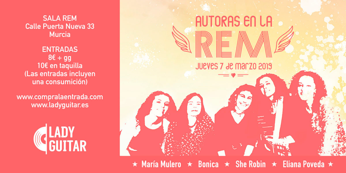 María Mulero, Bonica, She Robin y Eliana Poveda en la Sala REM_ Autoras en la REM el 7 de Marzo con María Mulero, Bonica, She Robin y Eliana Poveda. HORARIO Hora de apertura: 21.30 horas.Hora de comienzo: 22.00 horas. ENTRADAS Entrada anticipada: 8€ (+ gastos)Entrada en taquilla: 10€. La entrada incluye consumición.