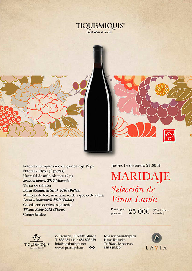 Nueva cata Maridaje en Tiquismiquis Gastrobar & Sushi. Esta vez el protagonista es el vino Lavia. Si quieres degustarlo ven y disfrútalo este Jueves 14 de Enero a las 21:30