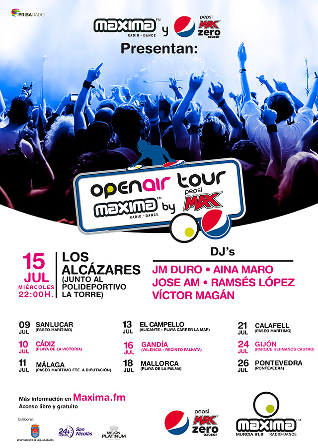 Llega a Los Alcázares la gira de música dance más potente del Verano "Máxima Open Air Tour by Pepsi", una gira con la que están recorriendo las principales playas de España a ritmo de la música más actual. Máxima Open Air Tour arrancará el próximo 9 de julio en las playas de Andalucía y llegará al Mar Menor, el Miércoles 15 de Julio a la gran avenida que se encuentra en la zona del Complejo deportivo La Torre, cerca del campo de golf La Serena.