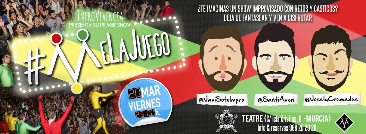 ImproVivencia presenta: #MeLaJuego, un show único e irrepetible que hará disfrutar al público de un ejercicio de creatividad espontánea. Se trata de un CONCURSO donde tres improvisadores se retan encima de un escenario a través de diferentes PRUEBAS. No competirán por ganar, sino por no perder y recibir el CASTIGO FINAL. Y aún hay más, porque el único juez de este espectáculo improvisado es... EL PÚBLICO. ¿Quién será el castigado? Javi Soto, Joselu Cremades o Santi Avendaño...