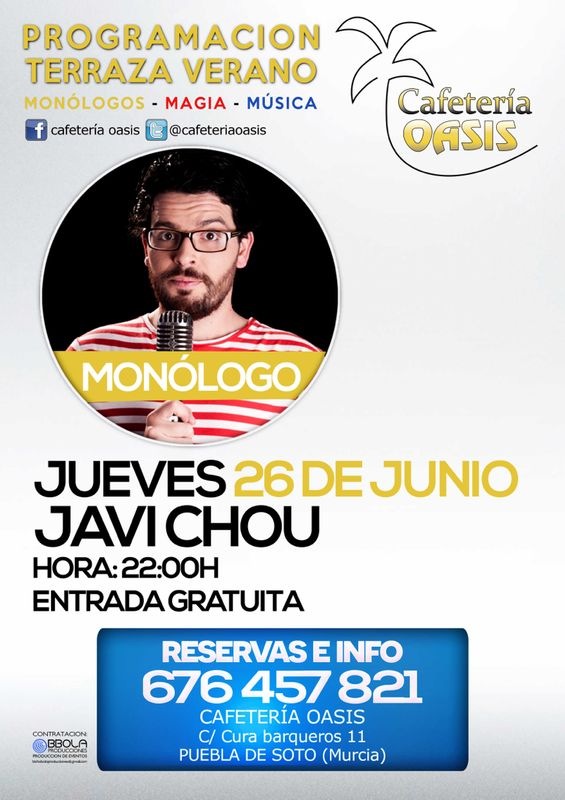 Una semana más de comedia este Jueves 26 en "La cafetería Oasis", donde se podrá disfrutar de la noche murciana en su renovada terraza y con un monólogo de la mano de "Javi Chou".