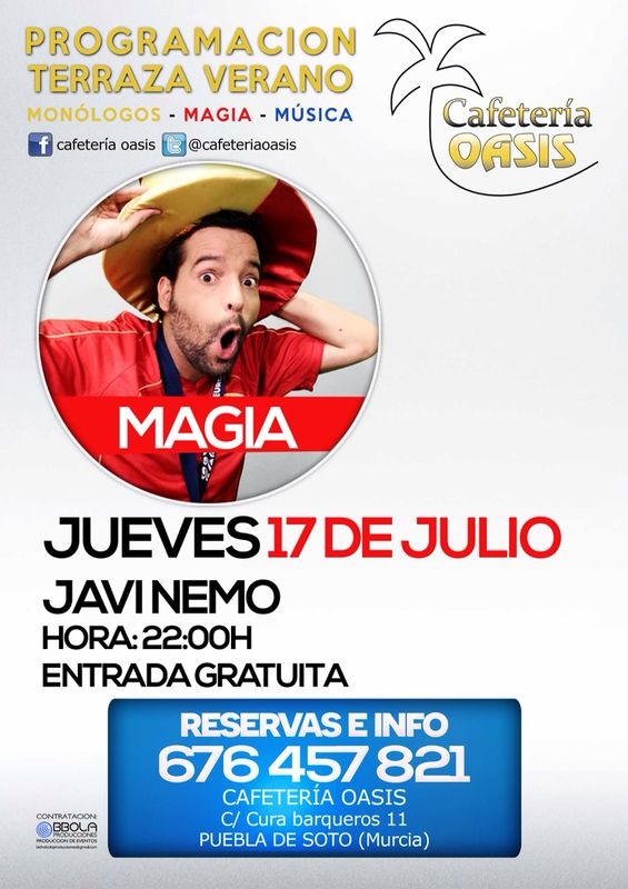 Ya entrados en verano tenemos otra semana más de comedia, este Jueves 17 de Julio en "La cafetería Oasis", donde se podrá disfrutar de la noche murciana en su renovada terraza y con un monólogo de la mano de "Javi Nemo".