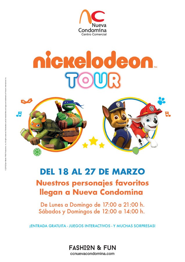 Nueva Condomina será el primer Centro Comercial en España en acoger el "Nickelodeon Tour" de la "Patrulla Canina", sin duda los personajes infantiles estrella de esta temporada. Acompañados de "Las Tortugas Ninja", el tour ofrecerá un espectacular show que arranca el 18 de marzo y estará hasta el día 27, para pasar un día lleno de artes marciales, acción, aventuras, misiones especiales… ¡y mucha diversión!.
