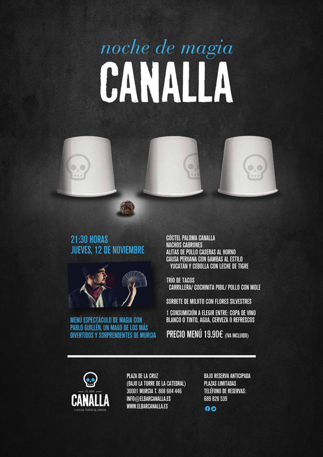 Qué mejor que pasar una noche de Jueves y descubrir un nuevo local en el centro de Murcia. Este Jueves 12 de Noviembre a las 21:30 Pablo Guillén (un mago de lo más divertido y sorprendente) en el Bar Canalla, junto a la torre de la Catedral.