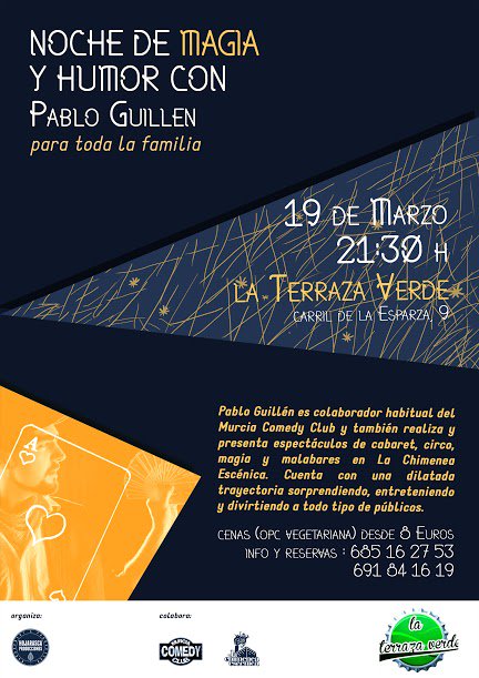 Pablo Guillén cuenta con una dilatada experiencia como cómico en Murcia Comedy Club y ha participado en espectáculos de circo, malabares, cabaret y magia en La Chimenea Escénica.