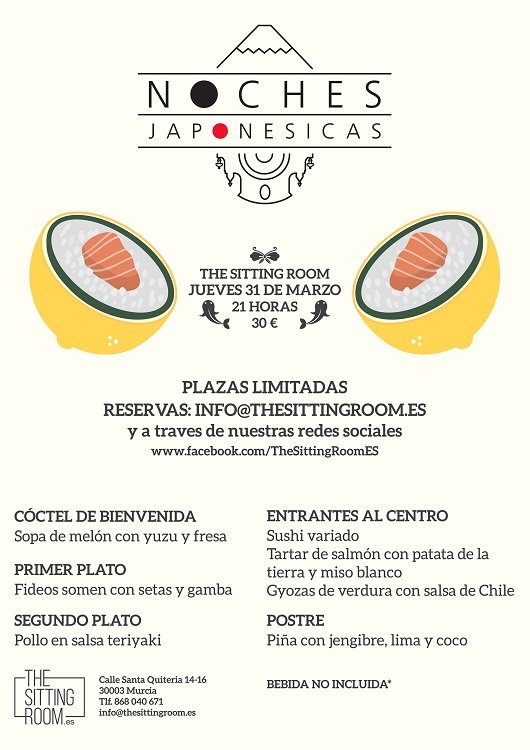 El espacio multidisciplinar de The Sitting Room (oficina no territorial de la agencia BAR Taberna de ideas y el estudio de proyectos e interiorismo 113, y a la su vez espacio para todo tipo de eventos y presentaciones: moda, gastronomía, talleres…) nos trae la segunda edición de “Noches japonesicas”. En estas cenas clandestinas se fusiona la mejor materia prima de Murcia con la gastronomía japonesa consiguiendo un resultado delicioso.