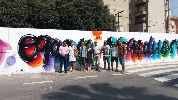 El concejal de Fomento, Roque Ortiz, ha visitado esta mañana el mural, de más de 100 metros cuadrados y situado en la calle Orilla de la vía frente al Centro Municipal, que ha sido realizado por ocho artistas locales durante una semana.
