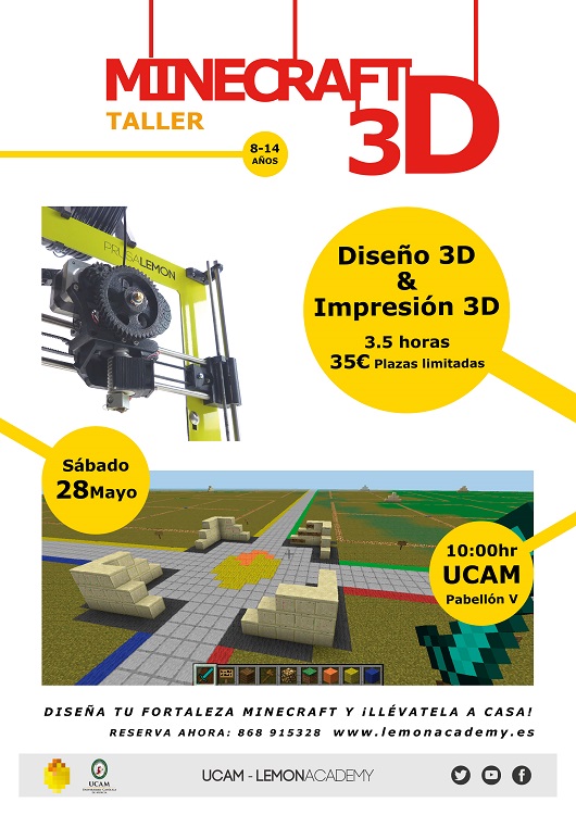 Lemon Academy nos presenta un nuevo taller de Minecraft 3D tras el éxito del realizado el pasado 16 de abril en las instalaciones de la UCAM. Este taller se realizará el próximo 28 de mayo y cuenta con las siguientes características: