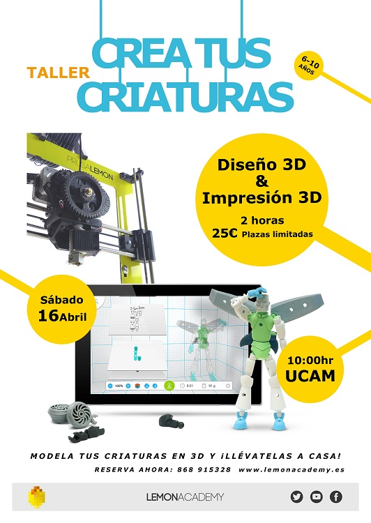 Lemon Academy nos presentan dos nuevos talleres de diseño e impresión 3D para el próximo 16 de abril: "Crea tus Criaturas" y "Minecraft 3D". Ambos talleres, que se realizarán de forma simultánea, se realizarán en las instalaciones de la UCAM durante la mañana del sábado 16 de abril. Los datos de cada uno son los siguientes: