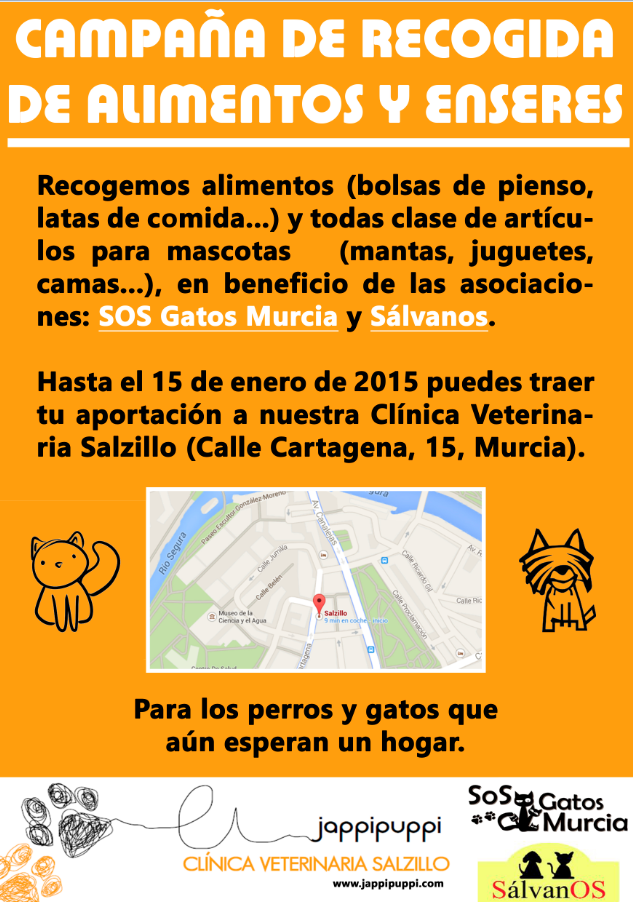 La Clínica Veterinaria Salzillo está llevando a cabo una gran recogida de alimentos (sacos de pienso, latas de comida...) y todo aquello que pueda servir (cunas, mantas, juguetes...) para los perros y gatos que aún esperan un hogar en las protectoras de: S.O.S. Gatos Murcia y Sálvanos.