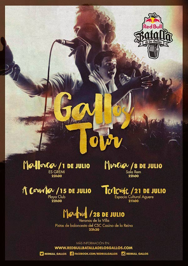Por primera vez en la historia de las batallas, los gallos salen a la calle y continúan en los escenarios. El freestyle iniciará su particular gira por el país para celebrar que este 2017 ha traído más gallos y más rimas, más grandes y fuertes que nunca, así que no hay competición que valga. Red Bull Batalla de los Gallos: El Tour , llevará el arte de la rima a cinco ciudades: Mallorca, Murcia, A Coruña, Tenerife y Madrid . Este tour contará con el actual Campeón Internacional, Skone como maestro de ceremonias, y con el famoso DJ Verse a los platos.