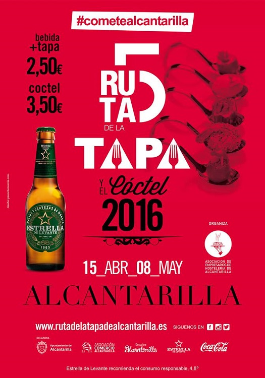Alcantarilla se encuentra celebrando su 5ª Ruta de la Tapa y el Cocktel, que podrá disfrutarse hasta el próximo domingo 8 de mayo. El precio de ésta edición es de 2'50 € bebida más tapa y 3,50 € el cocktel.