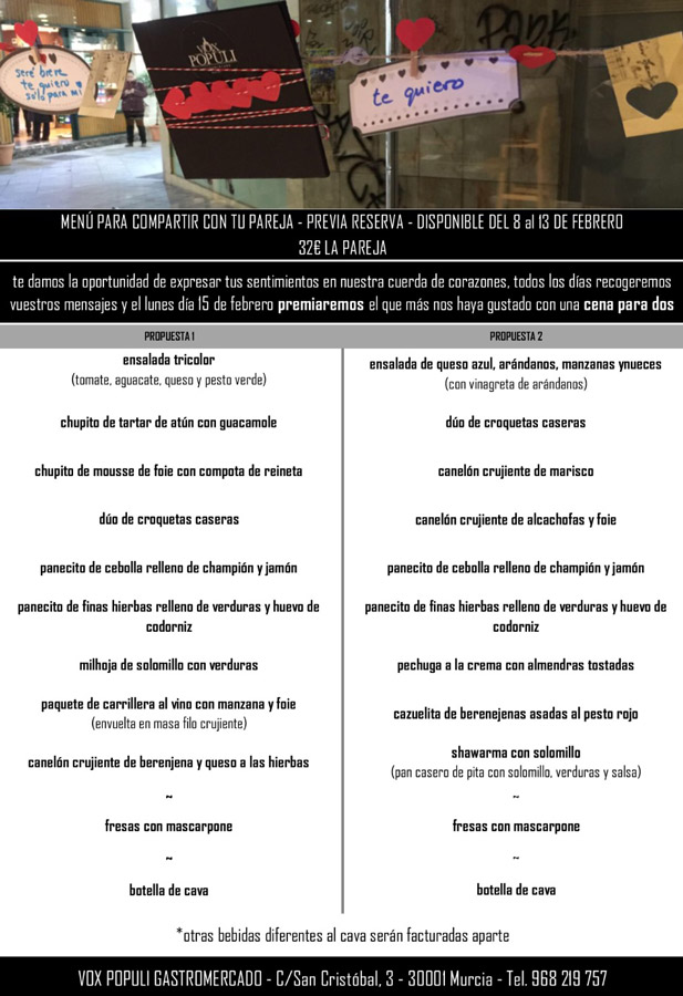Del 8 al 13 de Febrero Vox Populi nos ofrece un menú especial para este San Valentín 2016.Ven y compártelo con tu pareja.