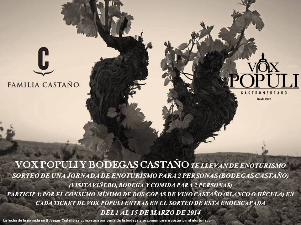 Por cada consumo mínimo de 2 copas de vino castaño (Blanco o hécula) en Vox Populi Gastromercado, entrarás en el sorteo de esta escapada. Puedes participar desde el 1 al 15 de Marzo de 2014.
