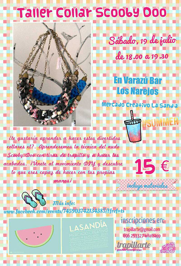 El próximo sábado 19 de julio dentro de la programación del Mercado Creativo de la Sandía, Trapillarte ha preparado este taller de COLLARES XL, donde aprenderemos a hacer el nudo de cuatro cabos, también conocido como nudo Scooby Doo, con tiras de trapillo. Aprenderemos a poner los accesorios a los collares: topes, cadena, cierres.
