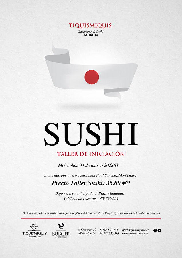 No dejes pasar la oportunidad y apuntate a este taller de iniciación de Sushi impartido por Tiquismiquis. El maestro encargado del taller es el propio chef del restaurante el sushiman Raúl Sánchez Montesinos.