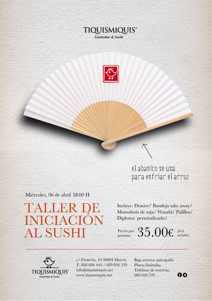 Qué placer anunciarles nuestro próximo TALLER DE SUSHI que tendrá lugar el miércoles, 6 de abril, en Tiquismiquis Gastrobar (C/ Frenería, 10 Murcia).