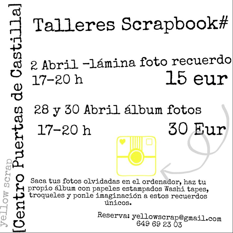 El precio del taller es de 15 euros, materiales incluidos, solo se debe aportar 1 o 2 fotos tamaño 10x15 o 9x13 cm. El taller se impartirá de 17:00 a 20:00. El aforo es limitado asi que lo olvides inscribirte en yellowscrap@gmail.com